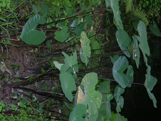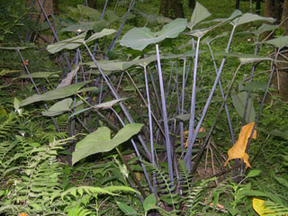 - 葉大型,有長柄,柄紫色,葉片卵形至心形,葉柄盾狀著生,葉基心形。